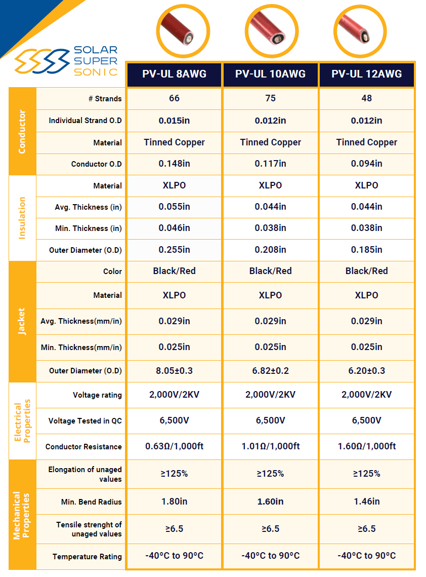 • Continuous operating temperature from -40°F to +194°F • Sunlight, UV, and Ozone resistant • Rated for dry and wet locations • Voltage rated 2000V • Underground Rated • Maximum temperature at conductor 248°F