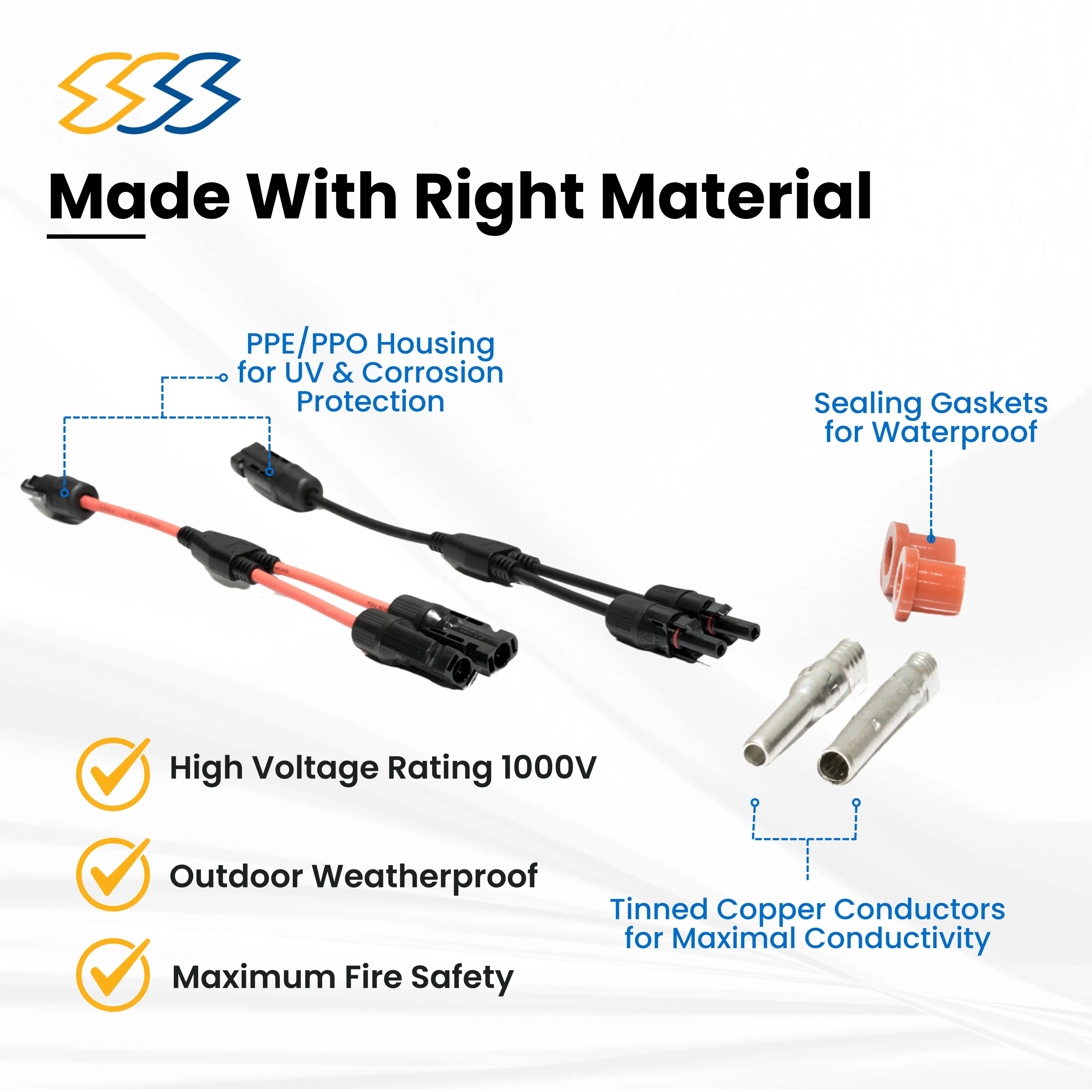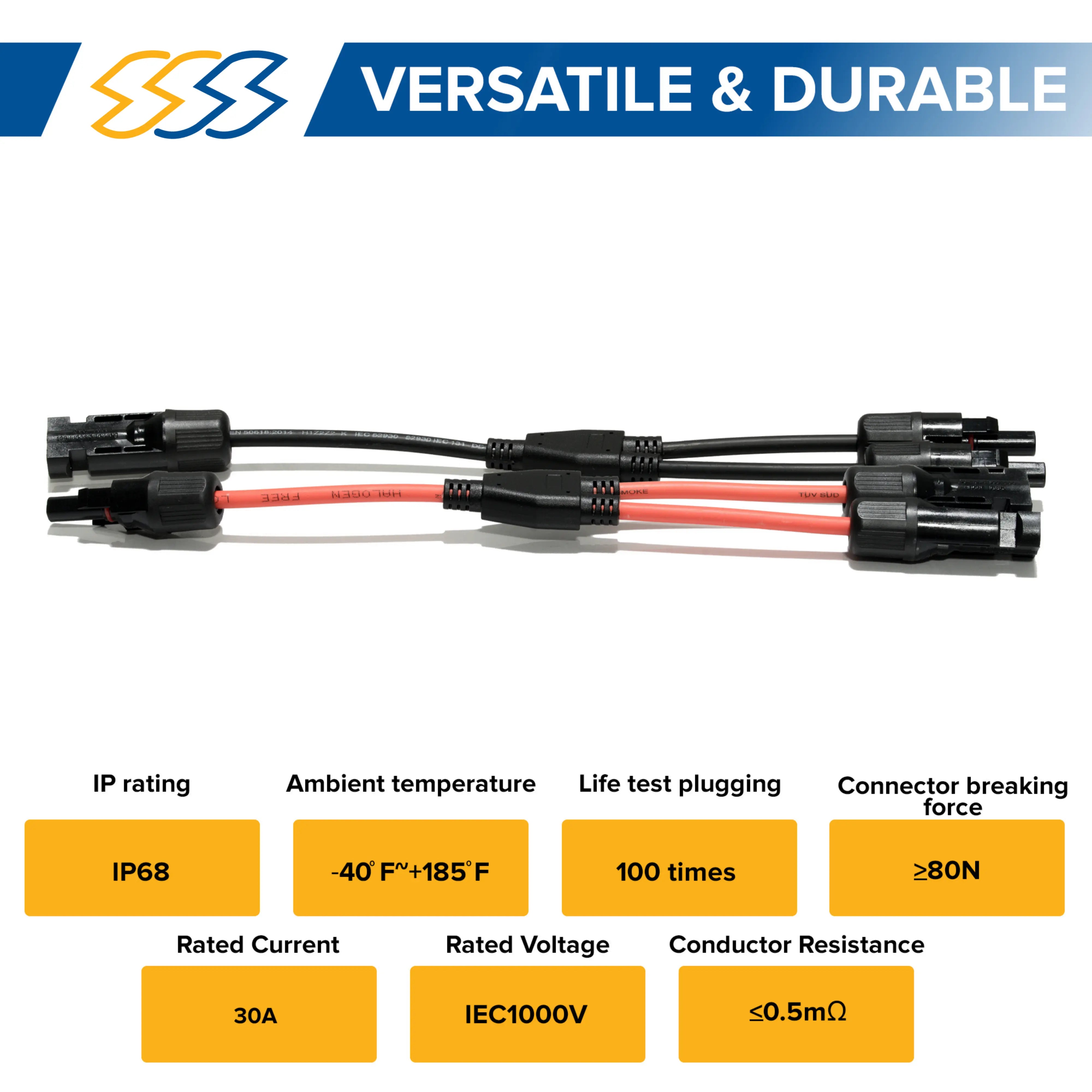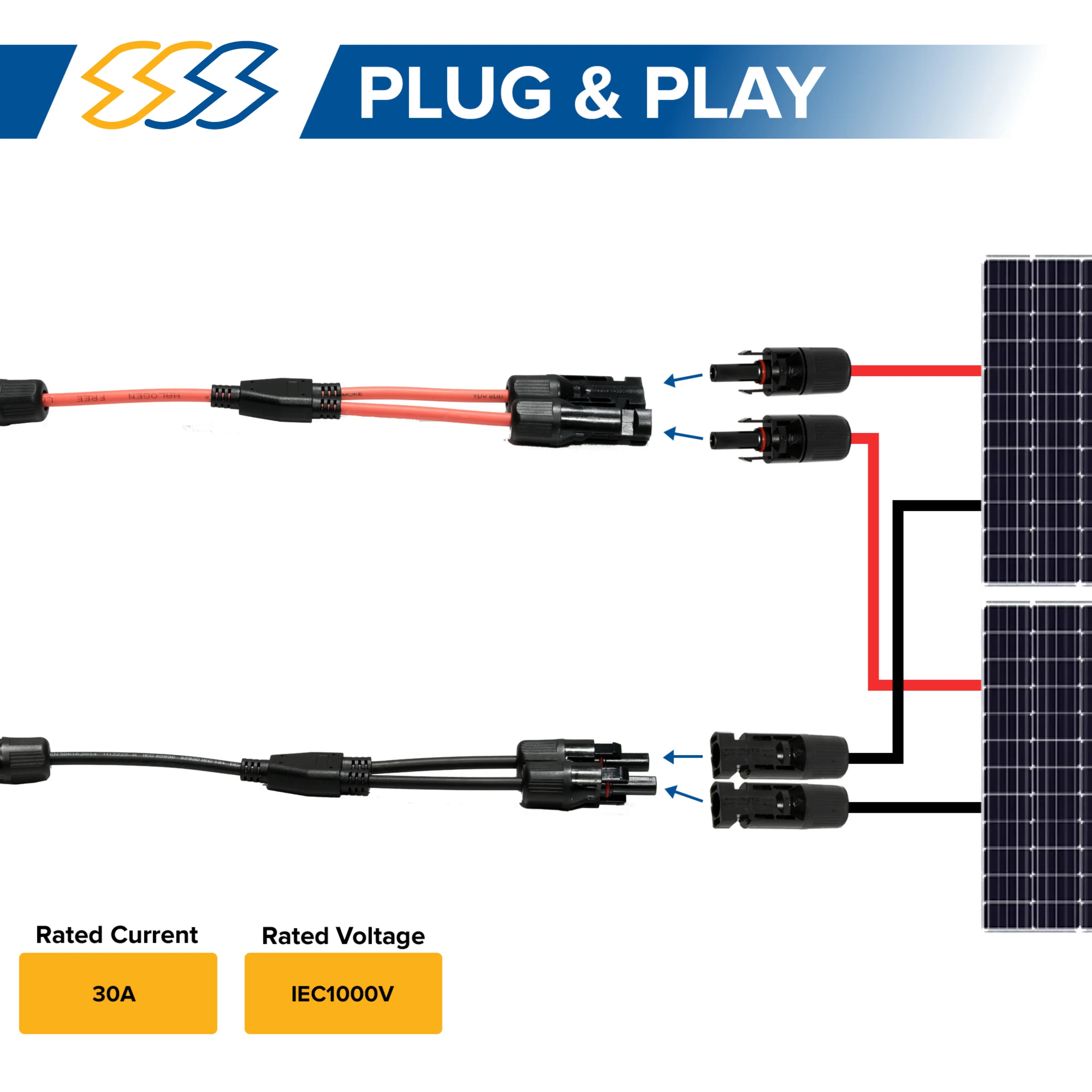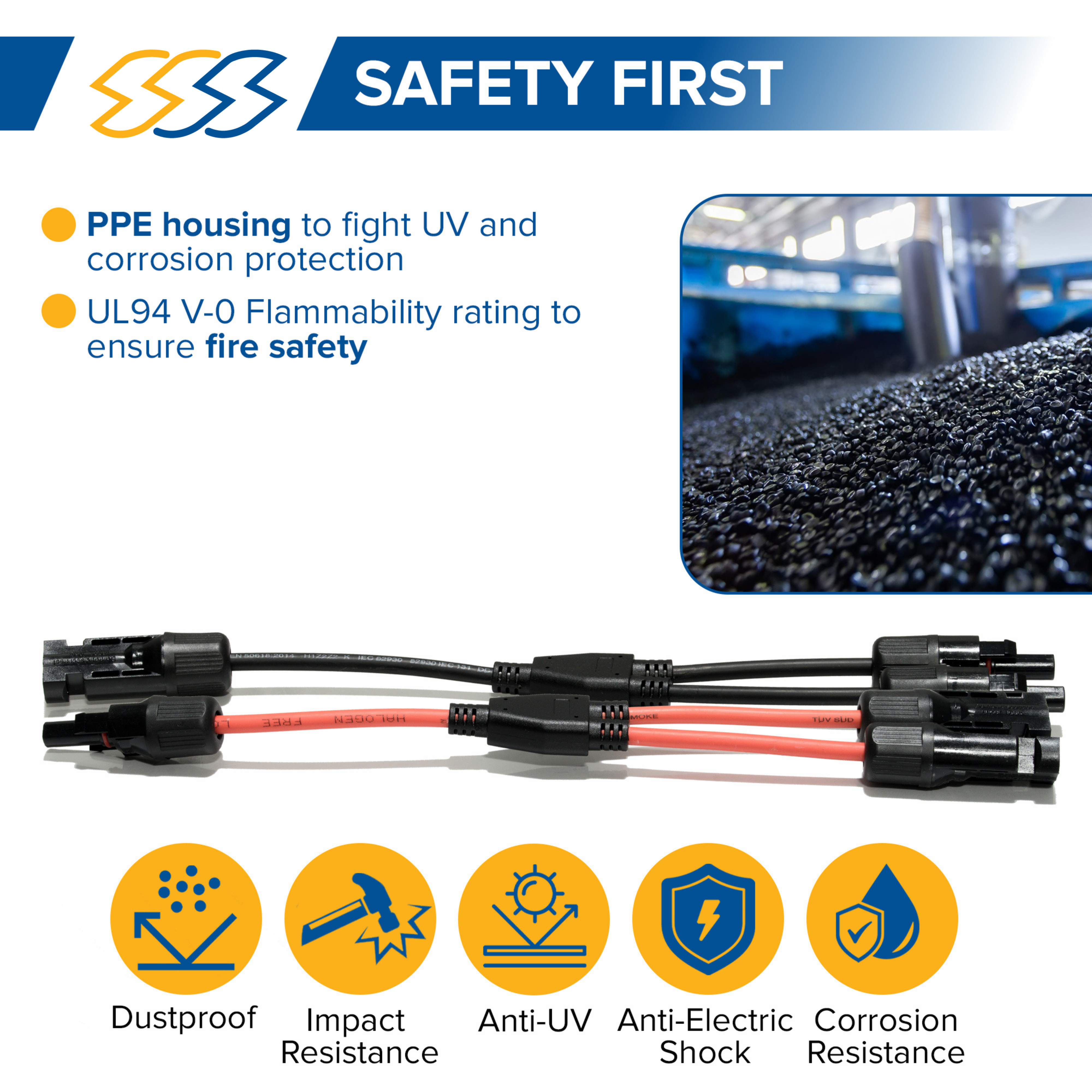 We prioritize safety and quality, which is why all of our connectors are assembled, inspected, and kitted in the US with globally sourced components. Our Y Connector Pair series allows for the parallel connection of two solar panels, making it easier and more efficient to harness the power of the sun.