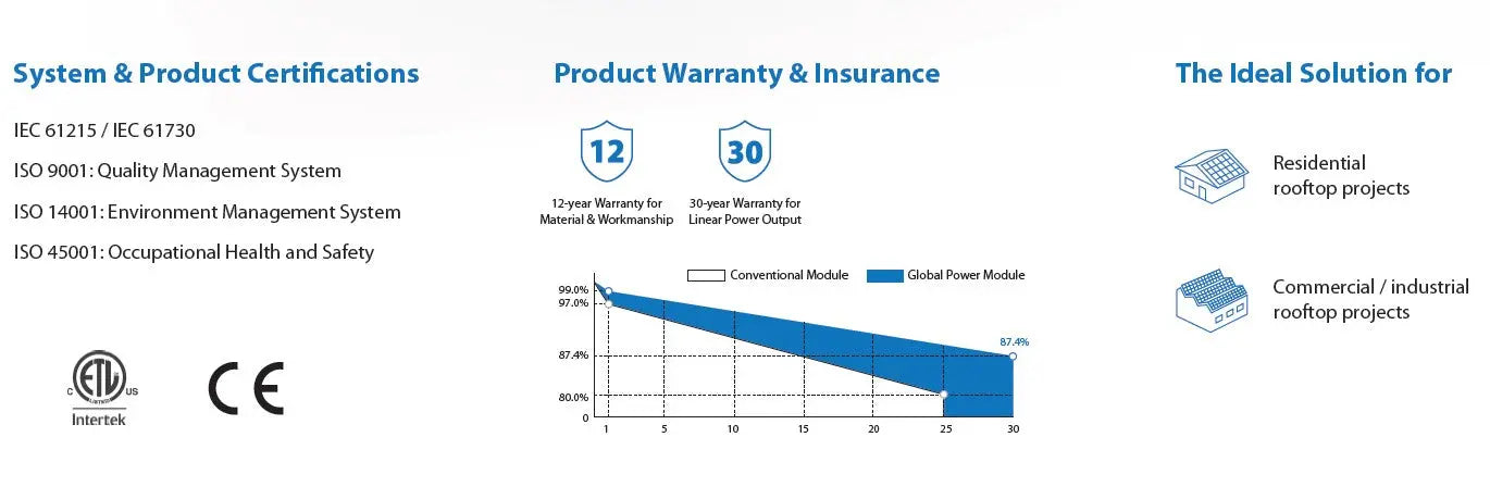 - Warranty: 12-Year Craftsmanship and 30-year Linear Power Output
