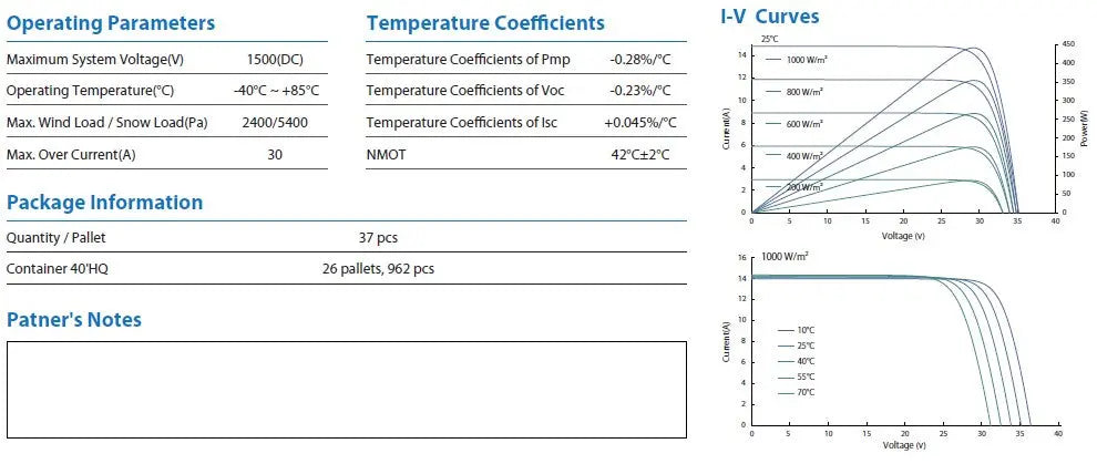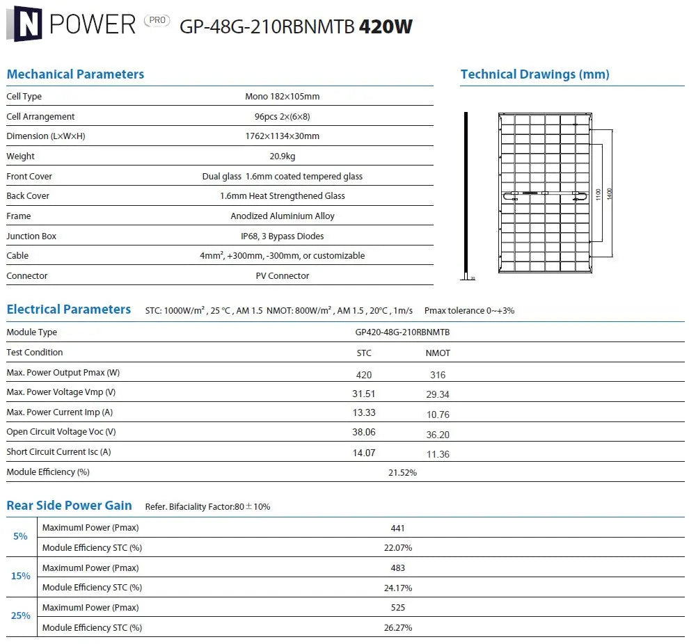 Mechanical Parameters: • Cell Type: Mono 182x105mm • Cell Arrangement: 96pcs 2x(6x8) • Dimension: 1762x1134x30mm • Weight: 20.9kg • Cable: 4mm², customizable Electrical Parameters: • Max Power Output (W): 420 (STC) / 316 (NMOT) • Voltage at Max Power (V): 31.51 (STC) / 29.34 (NMOT) • Current at Max Power (A): 13.33 (STC) / 10.76 (NMOT) • Open Circuit Voltage (V): 38.06 (STC) / 36.20 (NMOT) • Short Circuit Current (A): 14.07 (STC) / 11.36 (NMOT) • Module Efficiency: 21.52% Rear Side Power Gain: • Bifaciality Factor: 80% ± 10%