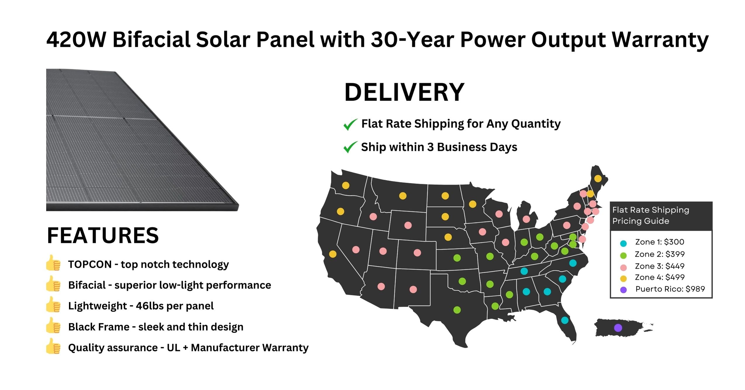 Delivery: • Flat rate shipping for any quantity • Ships within 3 business days Features: • TOPCON - Top-notch technology • Bifacial - Superior low-light performance • Lightweight - 46lbs per panel • Black Frame - Sleek and thin design • Quality assurance - UL + Manufacturer Warranty
