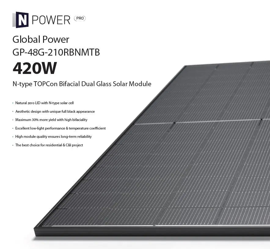 Global Power 420W Bifacial TOPCON NType Solar Panel | Tier 1 OEM | 30 Year Performance Warranty