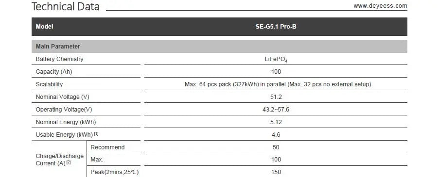 Main Parameter • Battery Chemistry: LiFePO₄ • Capacity (Ah): 100 • Scalability: Max. 64 pcs pack (327kWh) in parallel (Max. 32 pcs with no external setup) • Nominal Voltage (V): 51.2 • Operating Voltage (V): 43.2–57.6 • Nominal Energy (kWh): 5.12 • Usable Energy (kWh): 4.6 • Charge/Discharge Current (A): Max. 100 / Peak 150 (2 mins, 25°C)