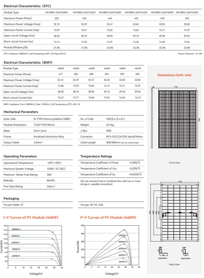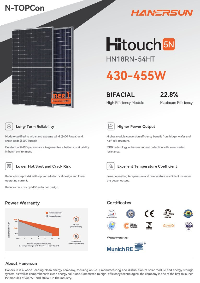 Hanersun 440W-450W Tier 1 | N-Type Topcon | Bifacial | 30 Year Warranty | 16.28KW per pallet